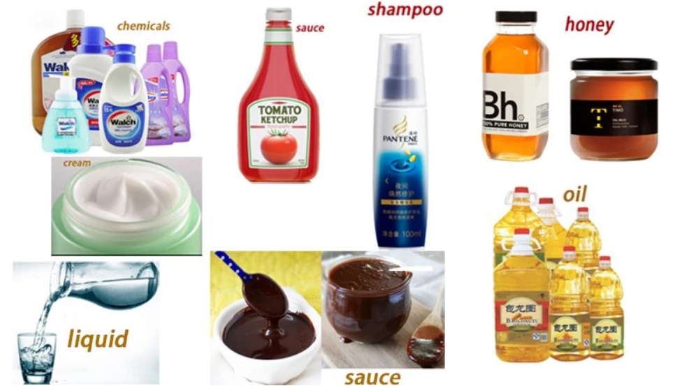 半粘稠液体;果酱,芥末酱,糖浆,莎莎酱,蛋黄酱,蜂蜜,花生酱,果冻,蘸酱,润唇膏,洗发水,浓肥皂,定型胶,面膜,蜡,胶水,油脂,密封剂,硅酮等